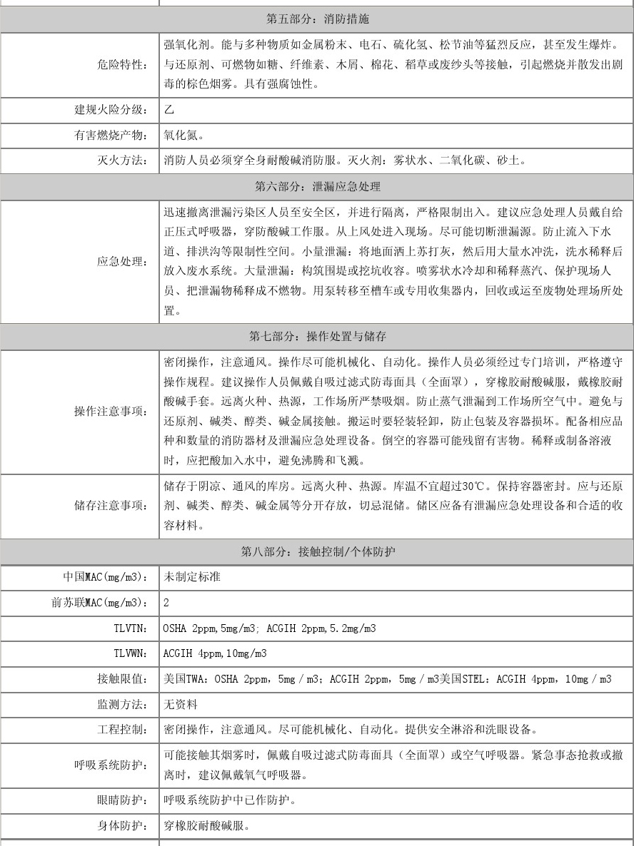 【物理性質(zhì)】純硝酸為無(wú)色透明液體,濃硝酸為淡黃色液體(溶有二氧化氮),正常情況下為無(wú)色透明液體。有窒息性刺激氣味。濃硝酸含量為68%左右,易揮發(fā),在空氣中產(chǎn)生白霧,是硝酸蒸汽與水蒸汽結(jié)合而形成的硝酸小液滴